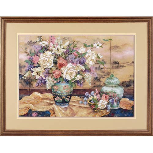Oriental Splendor Crewel Kit stitched in wool and yarn. A myriad of authentic oriental details enhance this gorgeous floral display. This sumptuous still life is created with wool and acrylic yarns and cotton and metallic threads. Kit contains Persian wool and acrylic yarns cotton embroidery thread gold metallic thread design printed in full color on white homespun with selected areas marked for stitching needle and easy instructions including an easy-to-read multicolor chart. Finished Size: 20x14" (51x36cm) Designed by: Lena Liu. Made in USA.