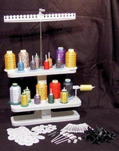 SHOPPERS RULE-Alphasew 20 Spool Stand. This great stand was designed to sit behind your machine for smooth and easy thread delivery. Stand is constructed of putty colored plastic and stainless steel for easy cleaning and light-weight for easy relocating. This stand holds up to twenty spools of thread from king cone spools to small snap spools. Stand features a weighted base to keep everything steady. This package contains one weighted spool stand base; two 10 hole thread holders; one safety thread cutter; twenty spool pins for upright cones and four horizontal spool pins for side dispensing s