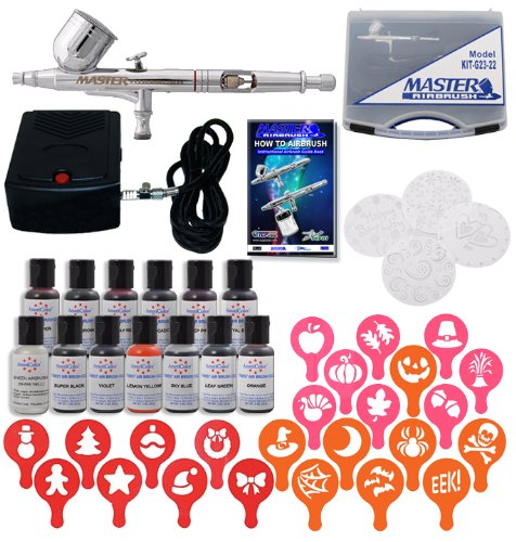 - According product rating in major online retailers, one of good products to buy is MASTER Airbrush CAKE DECORATING SYSTEM, Precision Dual-Action Gravity Feed Airbrush Set with Mini Air Compressor Plus 12 Americolor AmeriMist Airbrush Food Colors and 4 sets of seasonal Airbrush Stencils and Birthday Stencils with FREE Storage Case-The Complete Set Now Includes a (FREE) How to Airbrush Training Book to Get You Started and also a (FREE) 13th White Pearlescent Color