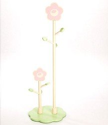 Encourage your little girl to put her clothes away using this pretty in pink clothes hanger. Double clothes hanger features child-friendly and doll-sized posts with sturdy green base topped by cheerful blooms. The clothes hanger is shaped like a flower with stems and leaves. One flower is the height for your daughter's clothes, and the other is for her baby's clothes. It has two clothes hanging trees, one the perfect height for your daughter, and the other for her doll's clothes. * Pretty pink flowered trees - one for "Mommy"& one for "Baby" to keep hats and clothing off the floor>. 54" H