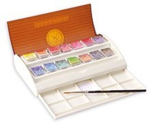 This Watercolor travel set by Sennnelier is an essential travel companion for the adventurous watercolorist. The plastic hard-shell case contains 14 half pans of French Artists Watercolor, a sable travel brush and a sliding palette drawer with a thumb holder. Lightweight and compact it contains the largest assortment of colors of any of the watercolor travel sets. Reformulated with an increased honey content gives each watercolor incomparable brilliance and luminosity while acting as a preservative to extend the paints longevity.